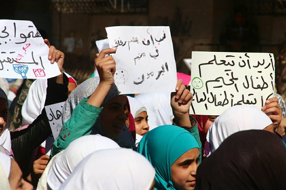ورفع الطلاب خلال وقفتهم الاحتجاجية شعارات ولافتات تؤكد حقهم في التعليم دون رعب أو خوف، وعبرت اللافتات أيضاً عن أهمية التعليم عند الطفل ومن تلك الشعارات “لانريد منكم طعاماً ولاسلة غذائية دعونا نتعلم”.