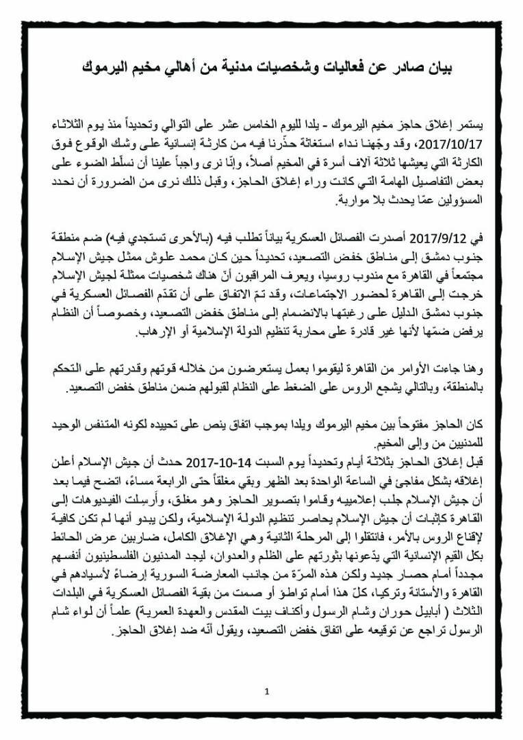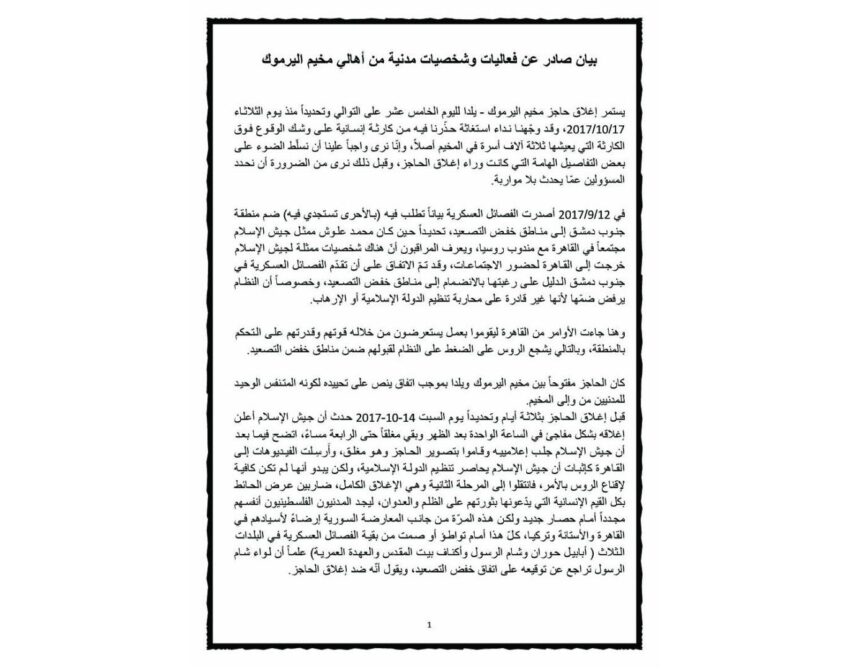 ووفقاً للبيان الذي تلقت المجموعة نسخة منه، فإن الفصائل الهسكرية كانت قد أغلقت الحاجز منذ صباح يوم 17 أكتوبر –  تشرين الأول 2017، لاستعراض قوتها وسيطرتها على المنطقة خلال اجتماعات ممثليهم مع روسيا.