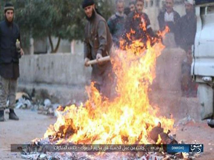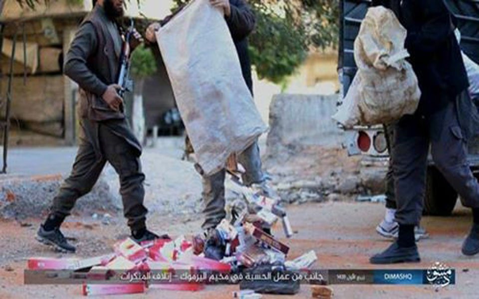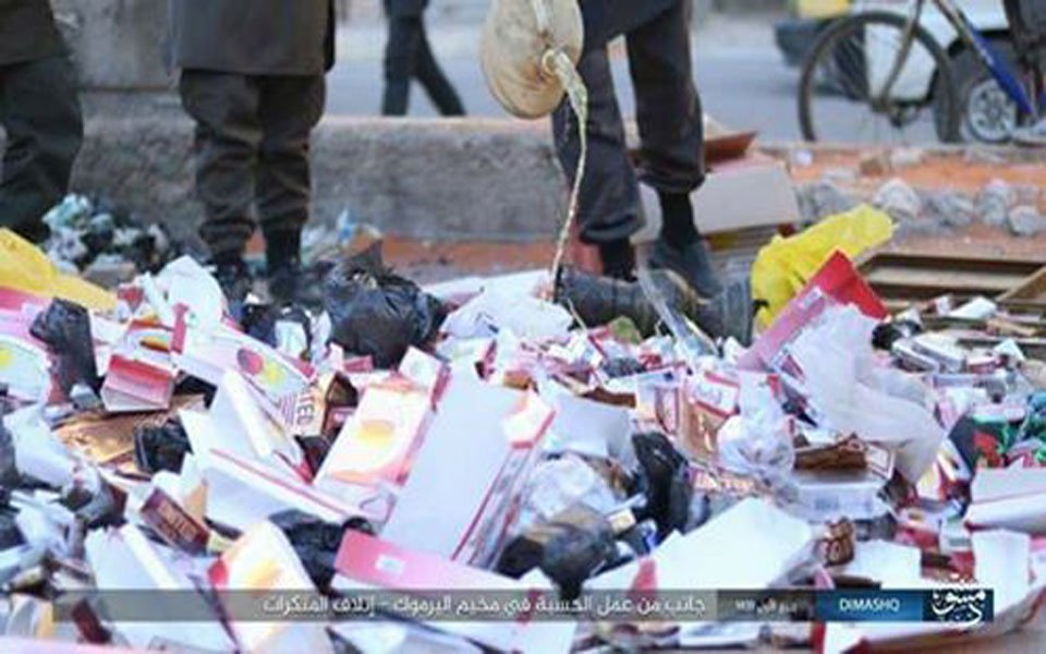 أظهرت صور نشرها تنظيم داعش على موقعه الرسمي قيام جهاز الحسبة التابع للتنظيم في مخيم اليرموك بإتلاف المنكرات حسب تعبيرهم.