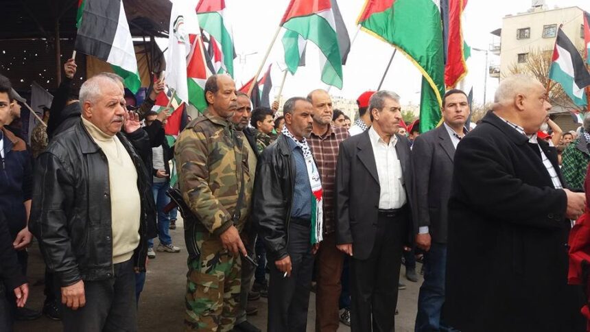 نظم العشرات من اللاجئين الفلسطينيين بمشاركة مجموعة من حركة فلسطين الحرة المحسوبة على النظام السوري وقفة احتجاجية عند مدخل مخيم اليرموك للاجئين الفلسطينيين بدمشق.