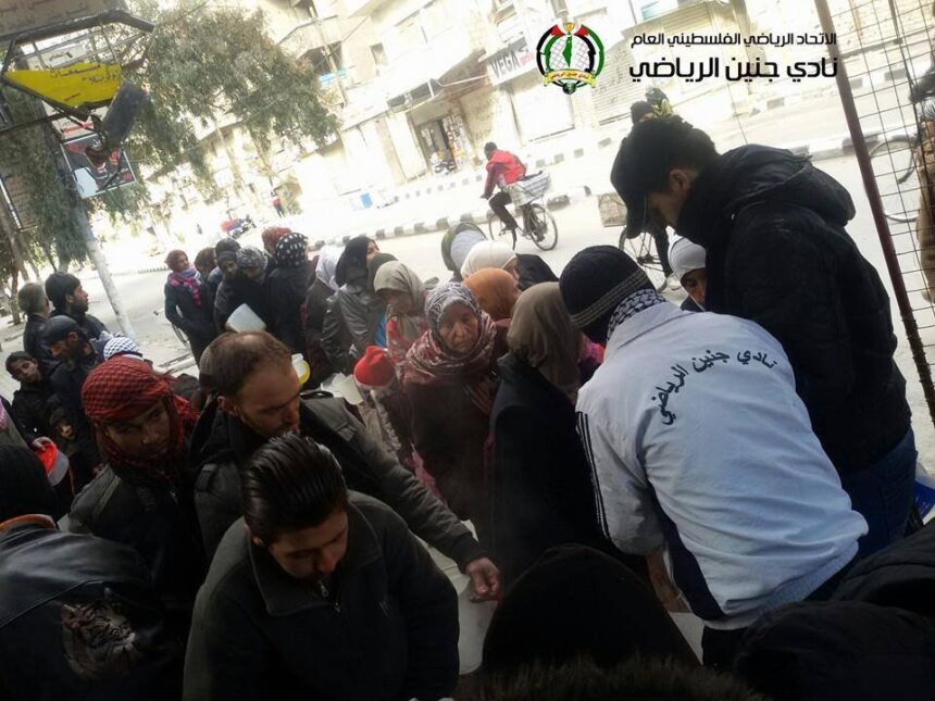 في محاولة منهم التخفيف من معاناة اللاجئين الفلسطينيين المحاصرين في مخيم اليرموك، قام عدد من أعضاء نادي جنين الرياضي في المخيم، بطهو كمية من الطعام وتوزيعها على العشرات من أبناء المخيم، الذين لا يجدون شيء من الغذاء ليسدوا به رمقهم.