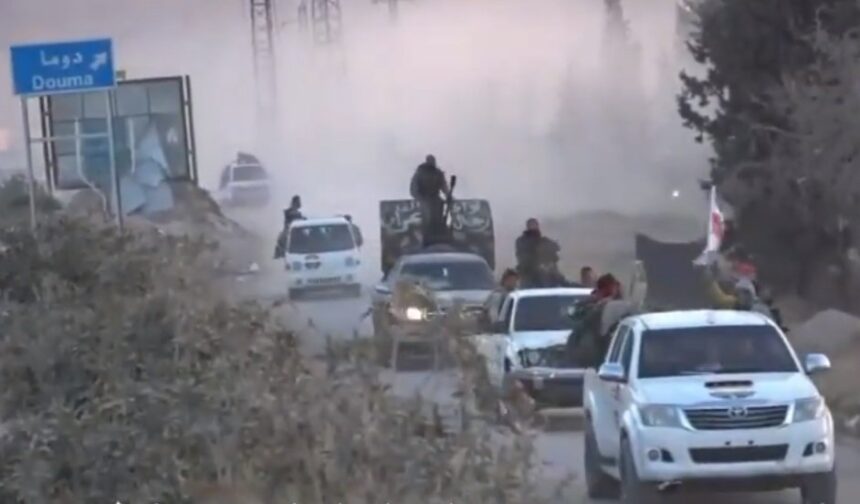 وتظهر في الصور أرتال عسكرية مزودة بالأسلحة المتوسطة والثقيلة وعليها شعار “لواء القدس” يقوم عناصرها بقصف بلدة دوما التي يتواجد فيها جيش الإسلام المحسوب على المعارضة السورية المسلحة.