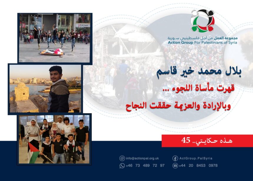 يسرد بلال لـ”مجموعة العمل من أجل فلسطينيي سوريا” حكايته التي كان محورها الإصرار والتحدي والتصميم، وتقديم نموذج لقصة نجاح ولدت من رحم المعاناة، قائلاً: “عندما يكون الأمل والإصرار متلازمان مع الانسان يزرع من اللاشيء شيء مهم وجميل ومميز وهذا ما حصل معي، مردفاً عند وصولنا إلى لبنان انقطعتُ سنة عن التعليم، ومن ثم استطعتُ أن أدرس الصف الأول الإعدادي (السابع) في مدرسة السموع بمدينة صيدا، لأن القوانين اللبنانية تمنع تسجيل الطلاب الفلسطينيين السوريين بمدارسها وجامعاتها إلا إذا كان لديهم إقامة نظامية.