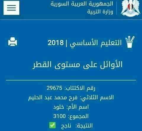 حصلت الطالبة “فرح محمد عبد الحليم” على المجموع التام في امتحان شهادة التعليم الأساسي السورية محققة مجموع 3100 درجة من أصل 3100، وبذلك تكون قد حققت المركز الأول على طلاب الجمهورية العربية السورية.