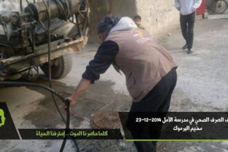 جفرا تقوم بتنظيف مجارير الصرف الصحي بمحيط مدرسة الأمل في مخيم اليرموك