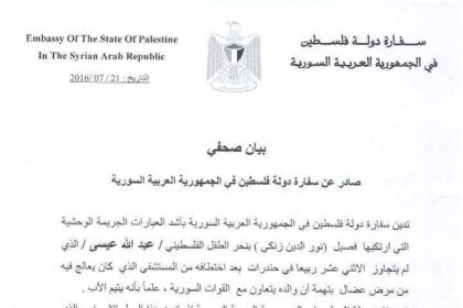 بعد صمتها عن سقوط آلاف الضحايا الفلسطينيين ومئات الأطفال، سفارة فلسطين بدمشق تستنكر مقتل “عبد الله عيسى” المحسوب على النظام السوري