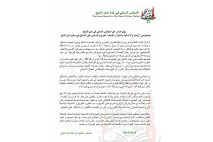 المجلس المحلي في بلدة خان الشيح: يدين استمرار الاعتداءات على المدنيين في مخيم خان الشيح ويؤكد خلوه من السلاح والمسلحين