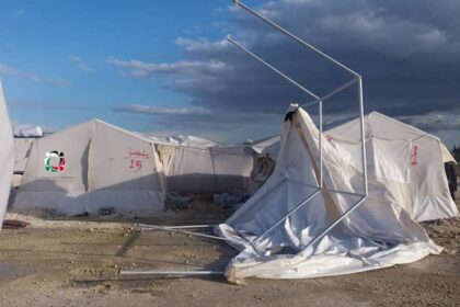 رياح قوية تقتلع خيام المهجرين الفلسطينيين في مخيم دير بلوط