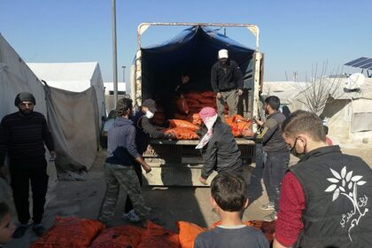 توزيع سلل صحية وحقائب مدرسية في مخيم الرمل باللاذقية