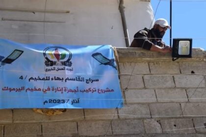 لجنة خيرية تنير مخيم سبينة بـ 25 جهاز إنارة يعمل بالطاقة الشمسية