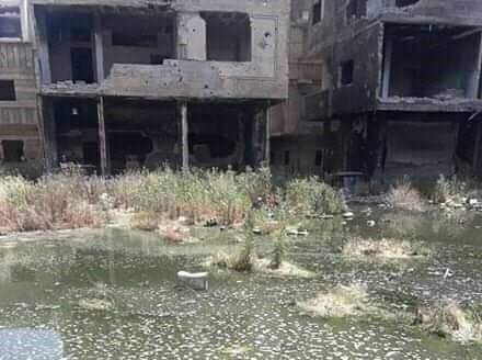 Palestinian activists and residents of AlThawrah neighborhood, in AlHajar AlAswad, south of Damascus, said civilian homes have been severely damaged by the stagnant water sitting in place for weeks.Â