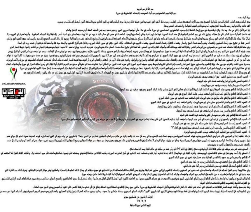 For the occasion of World Press Freedom Day, a number of Palestinian Syrian journalists issued a statement describing the difficulties that face journalist and documentary work of the events and the reality of Palestinians of Syria. They confirmed in their statement that the lack of financial resources and new technologies and the difficulty of access to the tension areas freely, have impacted negatively on documenting and transferring information, and on covering the event to the fullest, whether individual or group. The statement also enumerates number of reasons that led a lot of journalists’ victims, where some of them died by shrapnel, torture, assassination, or shot, and others were murdered by unknown groups. As well as, the statement documented a list of media workers who have died since the beginning of the events in Syria, in addition to the names of Palestinian journalists and media workers who are detained in the Syrian prisons.