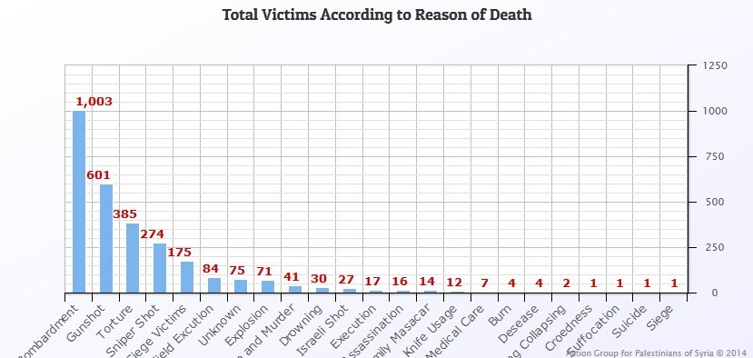 The AGPS documented statistics indicate that bombing is first reason that led to death of the Palestinian refugees in Syria, as it resulted in (1003) victim, while armed clashes are the second reason, as it resulted in (601) victims. Meanwhile, torture to death in the Syrian prisons comes at the third place, where the AGPS documented (385) names of Palestinian refugees who died under torture in the prisons of the Syrian regime.