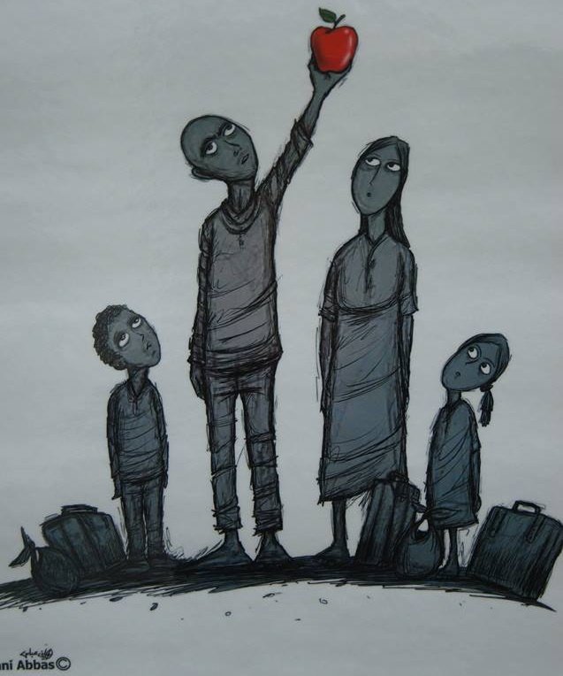The Malmo University at Sweden opened yesterday an exhibition for Hani Abbas the Palestinian Caricature Artist, coincided with the 67 anniversary of Palestine Nakba. The Artist expresses through his paintings the suffering of the Palestinian Syrian and the Syrian refugees during the ongoing war in Syria such as killing, displacement, detention, hunger and siege. Hani Abbas was rewarded so many Arabic and international awards, most prominent was from Caricature Artists for Peace organization in Genève, which is headed by former UN Secretary Kuffi Anan. It is referred that the exhibition is organized in cooperation between Malmo University, the Students league and the University Political freedom of expression league and Seraj organization for development and medical care.