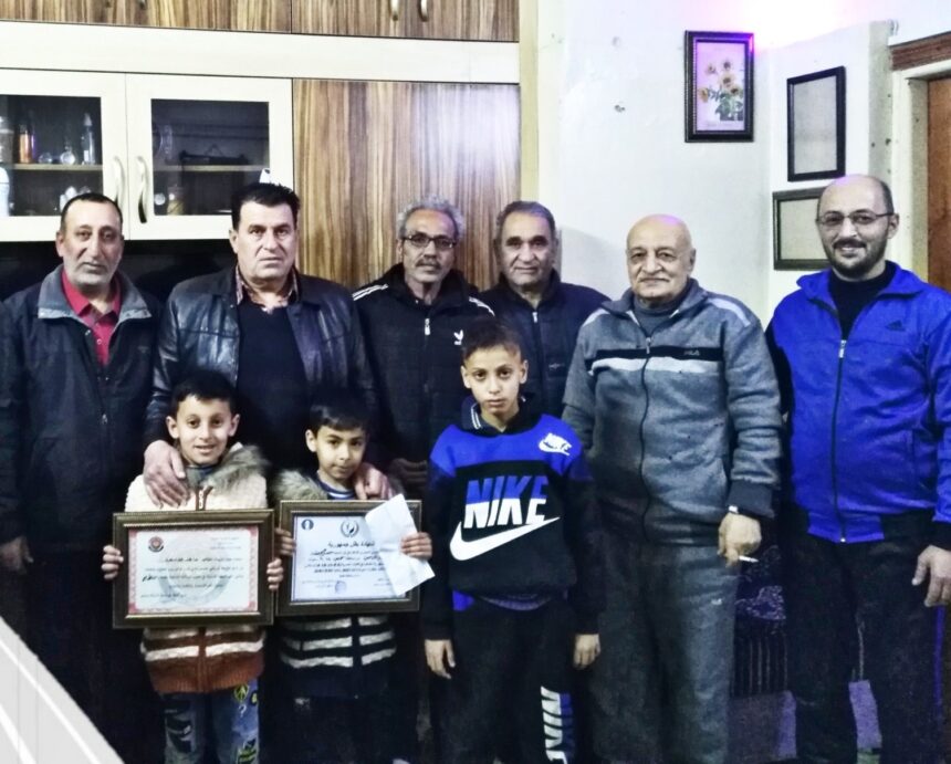 Palestinian refugee child Hussam Jaber Yousef was honored by the Palestinian Sports Federation after he snatched the first place in a chest contest in Hums and the fourth place at the Syrian Republic championship for the 8-year-old class.