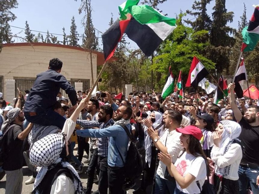 A number of Palestinian refugees rallied on Monday, May 17, outside of the UN office in AlMezzeh, in Damascus, protesting the escalating Israeli violence on the besieged Gaza Strip.
