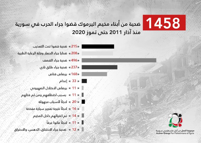 1,458 Palestinians sheltered in Yarmouk camp were killed in the raging Syrian warfare, 496 among whom died under shelling rocking the camp while the blockade and medical neglect took away the lives of 208 Palestinian refugees.