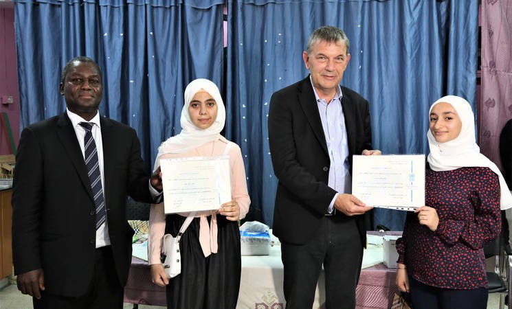 Honoring two UNRWA high achievers in the 9th grade national exams in Homs, Lazzarini said: “We are proud of your remarkable success despite the severity of displacement and hardship you have gone through.  You are a source of inspiration to others.”