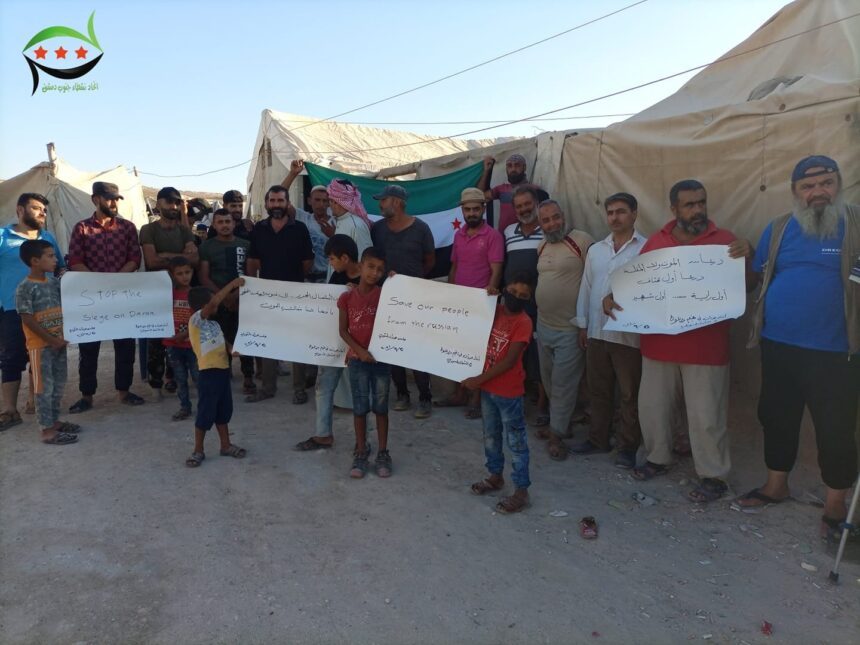 The rally-goers chanted slogans condemning the mass expulsion of civilians from the area and calling on the United Nations and international human rights bodies to take urgent action in response to the human rights abuses perpetrated by the Syrian regime and its Russian abettor.