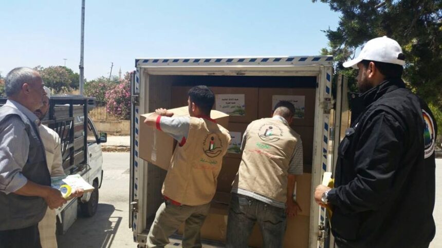 The convoy of Al Khair Al Aseel No 5, which was organized by the International Relief in cooperation with the Charity Committee for the Relief of the Palestinian People, distributed about 1000 relief parcels to the Palestinian families at Al Nairab and Handarat camps in Aleppo at Al Senaa school shelter and Al Wehda AL Tasea Shelter at Aleppo. It is mentioned that the residents of Handarat camp left the camp about 771 days ago after the control of the Syrian Opposition Groups over the camp.