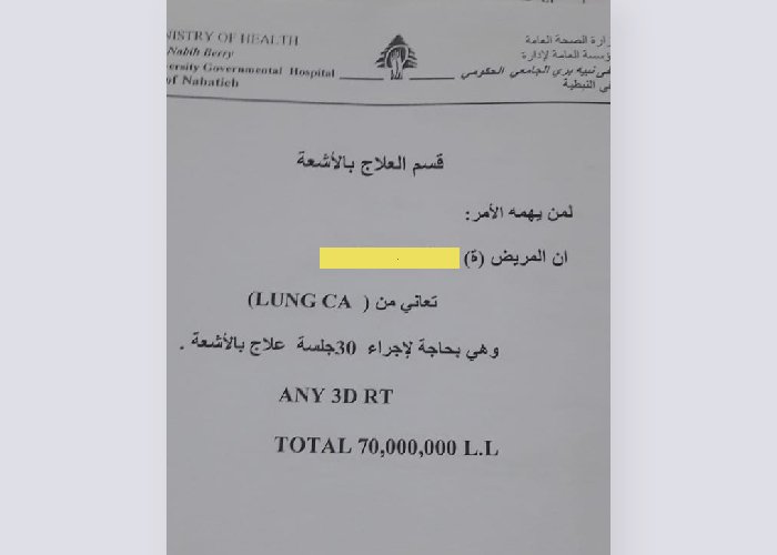 Medics said she is in urgent need of 30 chemical radiation sessions, at an estimated cost of 70,000 million Lebanese pounds (1,800 USD) and another 400 USD as travel expenses to Nabih Berri Hospital.