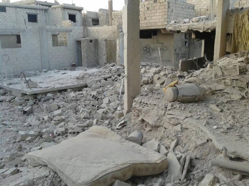 Massive destruction of buildings and property at Daraa Camp following the bombing with explosive barrels and cluster bombs that targeted the camp the day before yesterday.