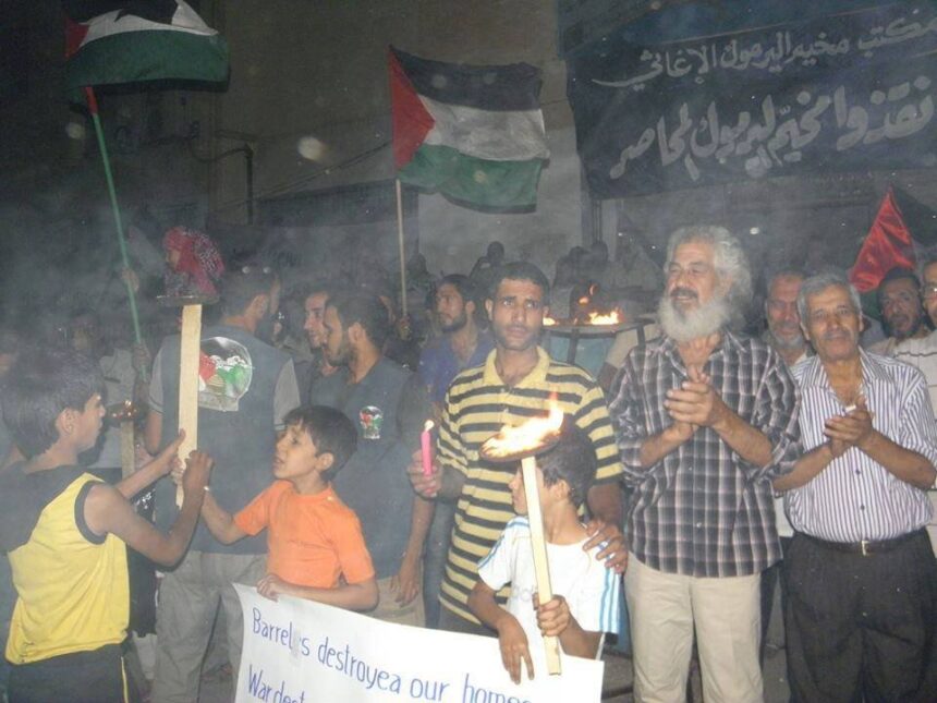 Residents of Yarmouk organized sit-in on Saturday night in front of Youth Support Center in Almadar is Street, demanding international institutions, Palestinian organizations, PLO, and UNRWA to intervene in order to lift the siege. The sit-in also demanded to allow entering medicines and food aid, and called to neutralize the camp about the ongoing conflict in Syria, confirming that they will remain the Yarmouk and adherence to the right of return to their homes in Palestine.
