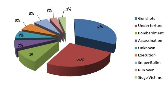The documentation and monitoring team of the AGPS announced that it documented the names of 31 Palestinian refugees who were killed during December 2014, including 8 refugees died due to torture in the Syrian regime prisons, while 10 refugees died due to gun shot, 3 refugees died due to shelling, as 2 refugees were assassinated, and 1 refugee died because of the siege and the lack of medical care.Meanwhile, a group, affiliated to the armed Syrian opposition has executed each of “Marea Al Madani” first sergeant cleaved of the PLA and “Mohammed Abu Siam” from the Yarmouk camp in charges of insulting God, while two refugees died due to sniper shot, and a refugee died crushed.