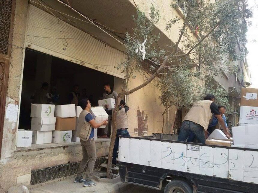 Jafra and Noor relief institutions distributed a number of food parcels to the Palestinian families who were displaced from the Yarmouk refugee camp, after the control of ISIS on the camp in cooperation with the Al-Nusra Front in the beginning of last April.