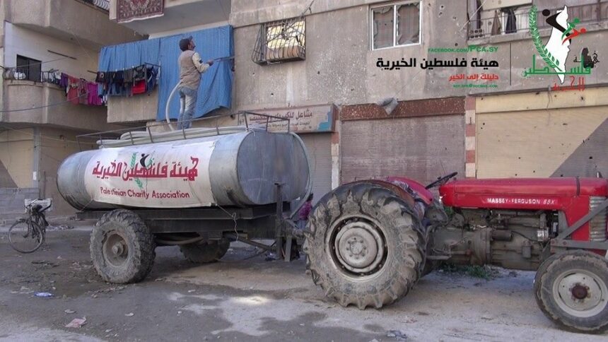 Services team of Palestine Charity Committee continues to provide relief services to the displaced people of Yarmouk at the neighboring towns, where the body provides some material assistance, as well as to provide drinking water for the residents.