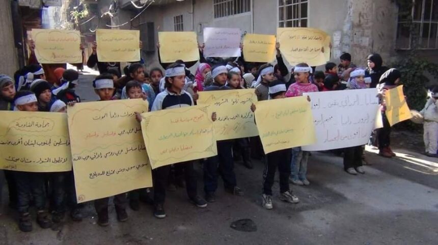 Entitled “Madaya is a sister of Yarmook”, Palestinian refugees children and activists organised a protest in solidarity with Madaya Town. The protesters expressed their feeling of solidarity with the besieged people in Madaya and other towns and cities across Syria, demanding     to lift the siege and deliver the humanitarian aid to starving people immediately. A social media campaign had been launched by activists on Facebook and Twitter in solidarity with Madaya last week.