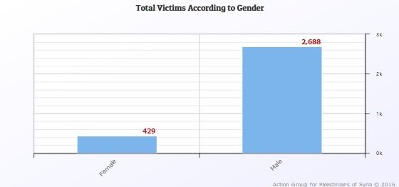 In Syria, AGPS monitoring and documentation team revealed a new statistics regarding the victims’ gender in Syria. AGPS said that (425) Palestinian female have been listed as victims in the recent four years, whereas, (75) are still in enforced disappearance by Assad regime. It is worth noting that the number of Palestinian victims in Syria is (3117) and the detainees (1048).Â
