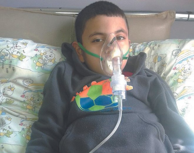 Qinaz Al-Nabulsi, the mother, said the illness of her child started in Syria where he inhaled gases fired at Al-Hajar Al-Aswad town in Damascus Countryside. The pathological case worsened due to the siege imposed on Al-Yarmouk camp where they were living, the child could not get the necessary medical care, this leaded to Cerebral Palsy, underwent a surgery afterwards subjected him to a severe bleeding.