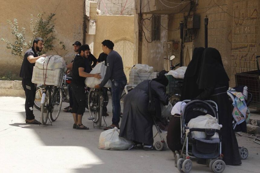 Jafra organization distributed some food aid to the Palestinian families who were displaced from Yarmouk camp to the neighboring towns. According to a relief worker, the distribution process depended on the statistics of the Relief Work Committee.
