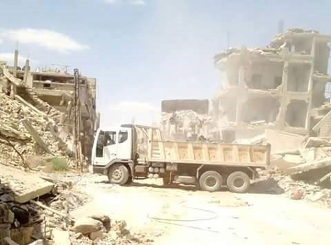 Media sources reported that the cleaning workshops of Damascus and Quneitra provinces in Sbeina town began working in Sbeina in order to deport mass and to open roads to restore people to the town. The sources published photos from inside the town during the process of removing the mass and rehabilitation services, those sources said that Damascus Electric Co. will start working after Eid al-Adha holiday, and will first work pulling broken medium and high tension electricity wires.