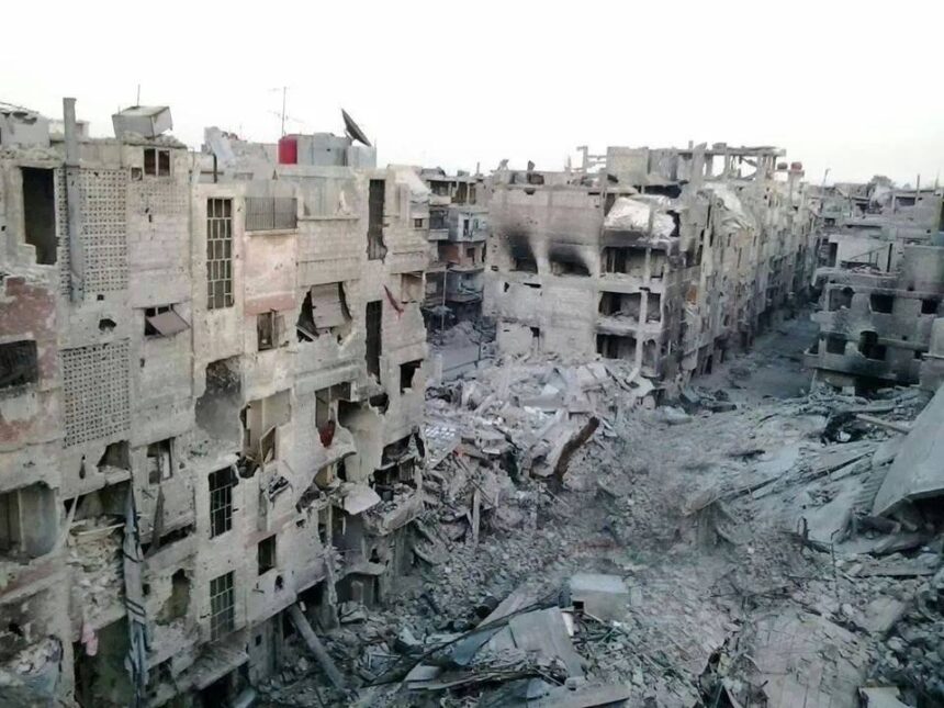 In the Yarmouk camp south of the capital Damascus, almost 40% of its buildings were partially and completely destroyed due to the war machine, where eye witnesses confirmed that the entrance of the camp is the most affected area for being a confrontation line among the Syrian regime and the armed opposition groups.