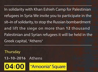 In the same context, Palestinian refugees in Greece call for a sit- in in solidarity with Khan Al- Sheih camp in Syria in order to stop the Russian and Syrian bombardment and lift the siege over 12000 refugees. They announced that the sit in will be held on Thursday 13 October 2016 at 4 p.m. in the Greek capital “Athena” in Amoonia Square.