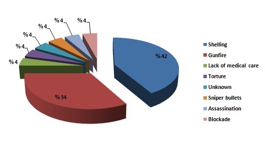 Ten Palestinians were killed by shelling while eight refugees were shot dead by gunfire. Another refugee was tortured to death in Syrian regime lock-ups. Two Palestinians were, meanwhile, gunned down by snipers in ongoing hostilities. The blockade and lack of medical care took away the life of one refugee. Another Palestinian was killed after he was kidnapped. A refugee died of unknown reasons.