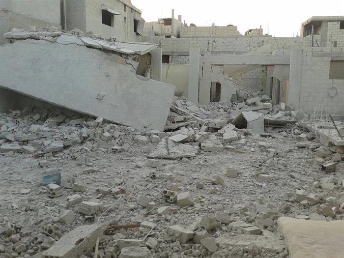 A Syrian government warplane launched an air strike on the Deraa Camp for Palestinian refugees, in southern Syria, and struck the nearby Al-Sadd Road, housing Palestinian families, with a gas cylinder, resulting in heavy material damage.