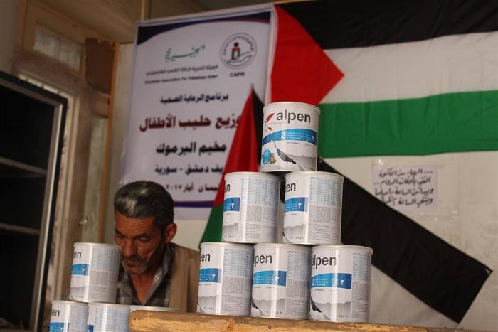 The Palestinian Charity Commission continues to distribute children’s milk to a number of families displaced from Yarmouk Camp in Yalda, Babila, and Beit Sahem.