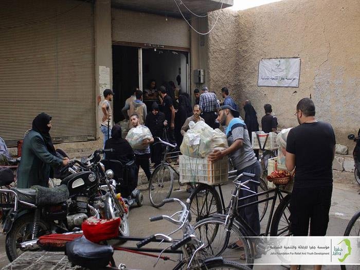 Jafra Foundation for Relief and Development in south Damascus is distributing food baskets to the families displaced from Yarmouk camp to the neighboring towns of Yelda, Babilla and Beit Sahm. The families were forced to leave their homes after ISIS took control of the camp in April 2015.