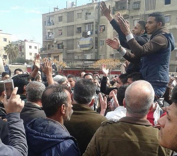 Dozens of the Yarmouk displaced residents carried out a sit-in at the main entrance of the camp near Al Bateikha crossing to demand to return back to their houses, to end the siege imposed on thousands of its residents, and to neutralize it of the ongoing war in Syria.