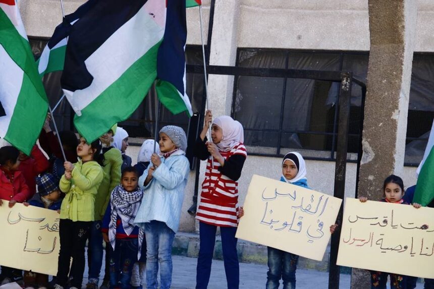 In the south of Damascus, the children of the Jenin Scout Group, organized a solidarity stand at the group’s headquarters in the town of Yelda, in support of Jerusalem and in rejection of the American President, Donald Trump’s decision to officially recognize Jerusalem as the capital of the Israeli occupation, and transferring the US embassy to it.