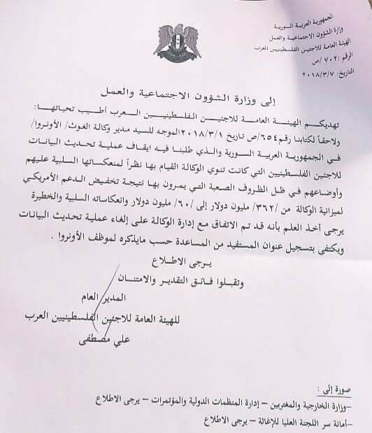 The General Authority for Arab Palestine Refugees in Syria had requested UNRWA, to suspend its process of updating the data of the Palestinian refugees, after it imposed conditions and requirements that were difficult and harsh for the Palestinian refugees in Syria.