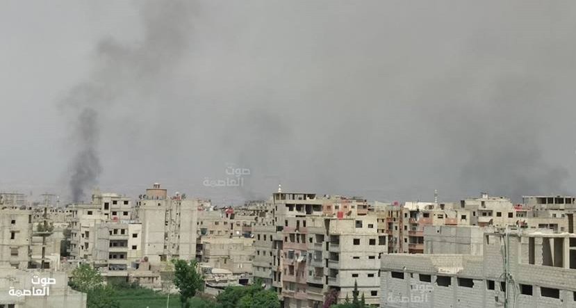 ISIS burning its headquarters in Yarmouk camp and Al-Hajar Al-Aswad neighborhood in preparation for the evacuation of the area and its exit from the south of Damascus, to the areas controlled by the organization in Syria. Columns of smoke were seen rising from Yarmouk camp, according to pictures broadcast by the “Sout Al-Aasema” website, where ISIS took the homes of civilians as its headquarters and as centers to fortify it in its battle with the Syrian regime.