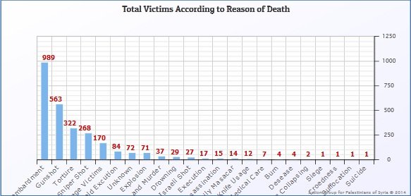 The documented statistics on the AGPS website “actionpal.org.uk” indicated that the bombing is the first reason that led to the death of (989) Palestinian refugee victims in Syria. Meanwhile, the armed clashes were the second reason that caused the death of (563) victims, as the torture to death in Syrian jails comes in third place where the AGPS documented the names of (323) Palestinians refugees died under torture in the prisons of the Syrian regime.