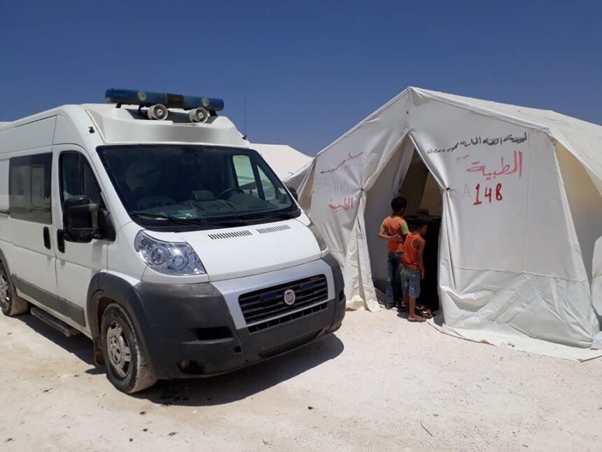 The Palestinian-Syrian Authority for Relief and Development prepares ambulances for the displaced in the Deir Balout camp, north Syria