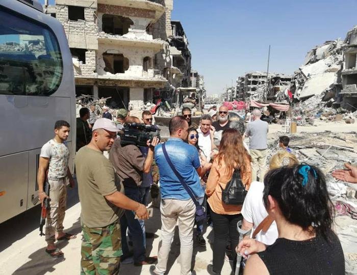 In south Damascus, an Irish parliamentary delegation organized an inspection visit to Yarmouk camp for Palestinian refugees, accompanied by the military commander of the Free Palestine Movement, Saeed Abd El-Aal, to find out the extent of the destruction and devastation, caused to the homes and properties of civilians, as a result of the shelling and the violent clashes that broke out between the Syrian regime forces on the one hand and Hayat Tahrir Al-Sham on the other.