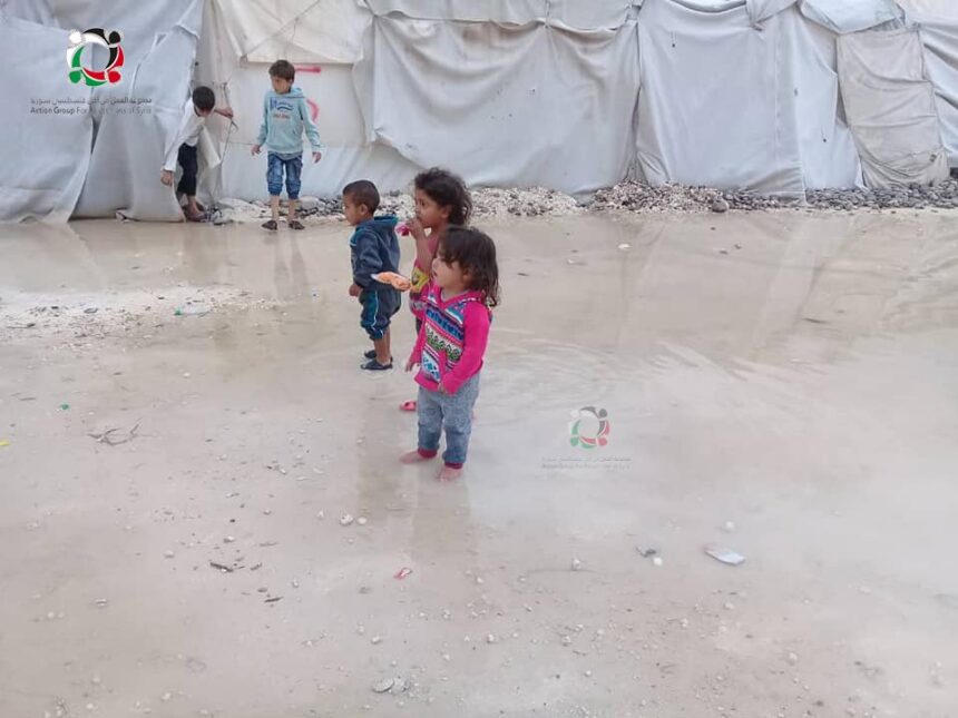 Tents have been uprooted and others have fallen apart as torrential downpours have swamped Deir Ballout Camp for Palestinian refugees in Jindires in Afrin, north of Syria.
