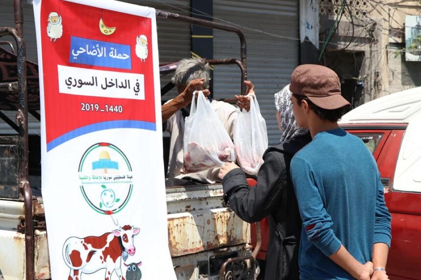 The Relief Commission of Palestinians of Syria handed over meat portions to Palestinian families displaced from southern Damascus, Yarmouk Camp, and Khan Eshieh Camp to Idlib, in northern Syria.